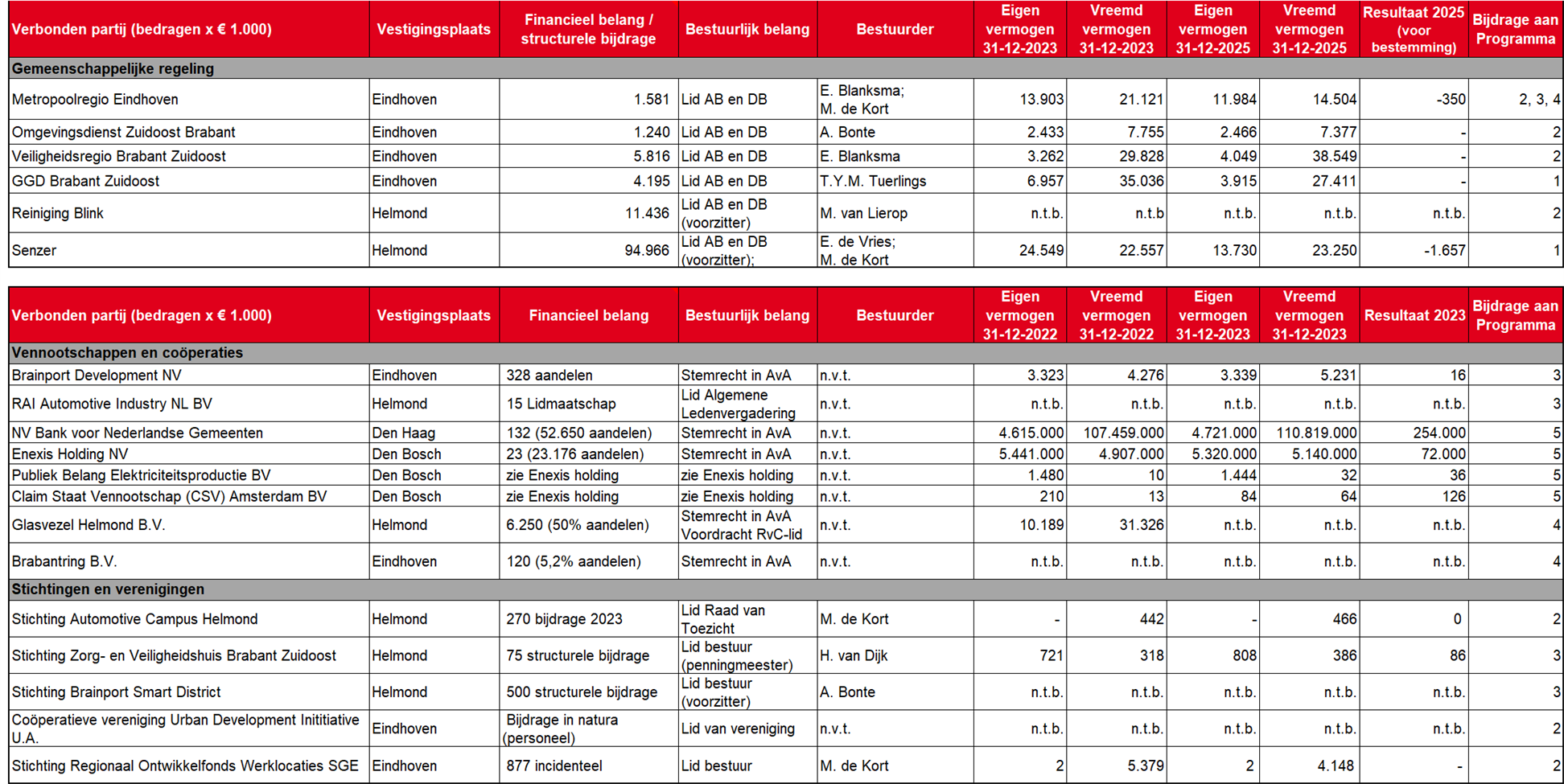 Verbonden partij (bedragen x € 1.000) | Vestigingsplaats | %username%: | Bestuurlijk belang | Bestuurder | Eigen vermogen 31-12-2023 | Vreemd vermogen 31-12-2023 | Eigen vermogen 31-12-2025 | Vreemd vermogen 31-12-2025 | Resultaat 2025 (voor bestemming) | Bijdrage aan Programma |